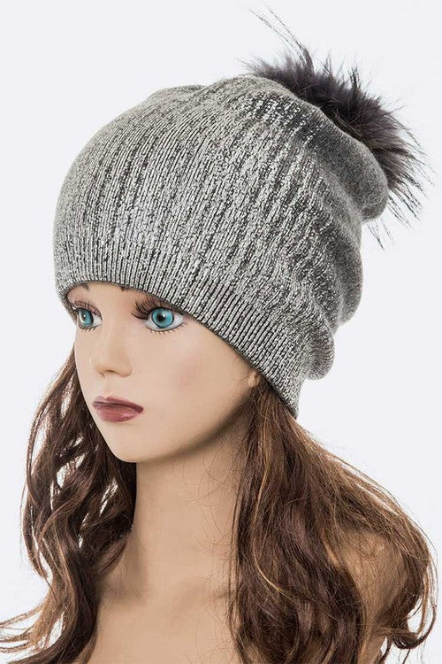 One Size Snug Fit Composition - Wool Blend Cashmere Natural Raccoon Fur Pom Detachable Pom Pom