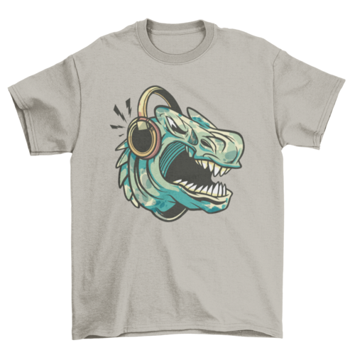 Fun t-shirt design featuring a dinosaur with headphones.