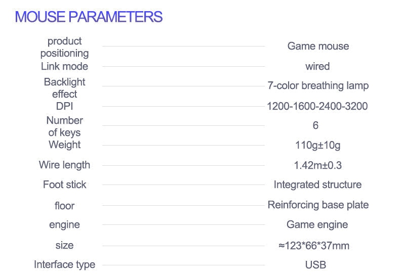 The use of enhanced durability game level Micro- motion, not only to move quickly, but also to click accurately, the mouse uses game specific white dot Micro- motion, strong rebound, long-term use, the feel is not easy to reduce!