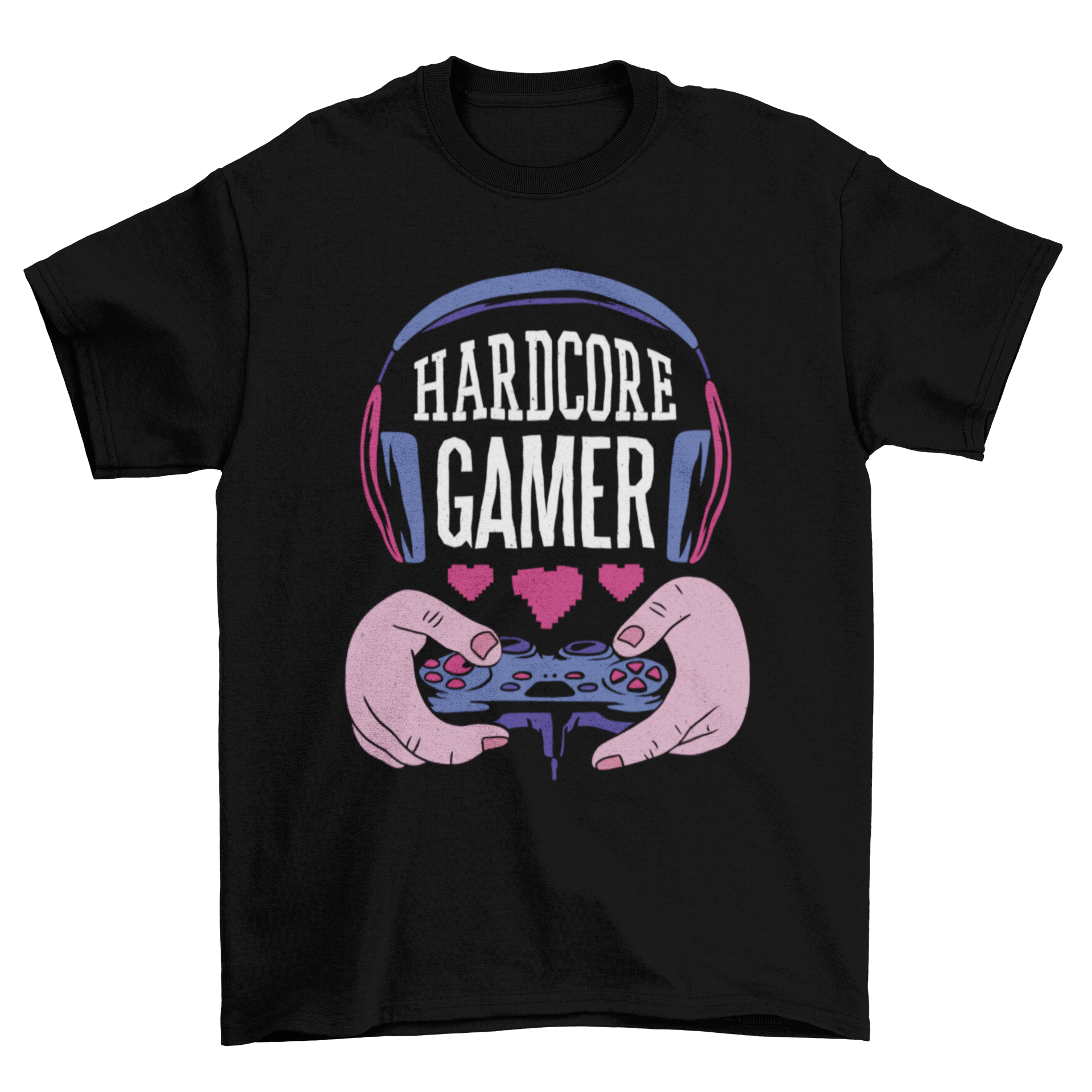 Cool t-shirt design featuring an illustration of a joystick headphones three hearts and the caption "Hardcore gamer".