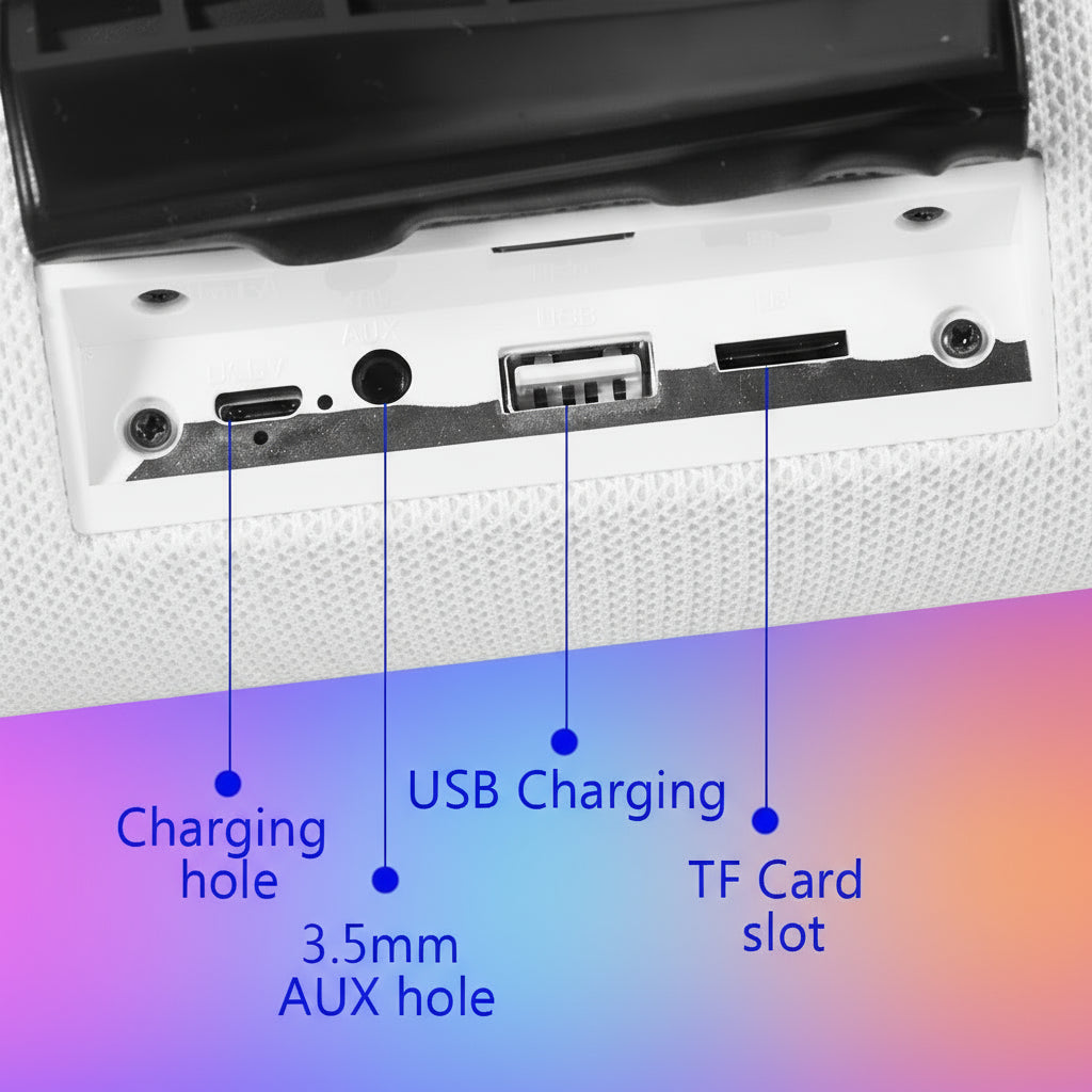 FeatureDetailsBluetooth Version5.0Wireless RangeUp to 10m (33ft)Battery Capacity1200mAhPlay Time6–10 hours (volume-dependent)Charging Time2–3 hoursWaterproof LevelIPX5Audio InputsTF Card, USB Drive, AUX (3.5mm)Music FormatsMP3, WMA, WAV, FLAC, APEFrequency Response80Hz – 20KHzSignal-to-Noise Ratio≥95dBDistortion Rate<0.5%MaterialABS + Mesh FabricAvailable ColorsBlack, Blue, Red, Blue/Red, Camouflage