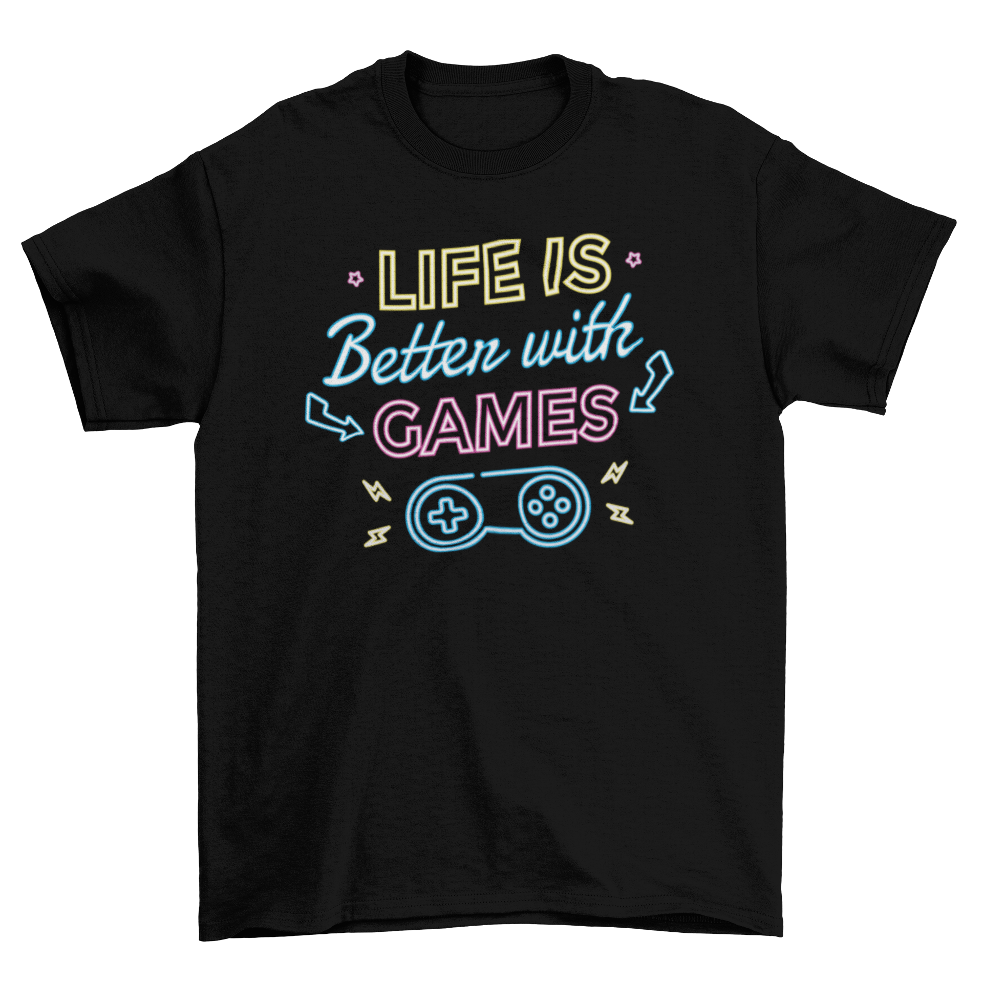 Awesome t-shirt design featuring the quote "Life is better qith games", in neon style